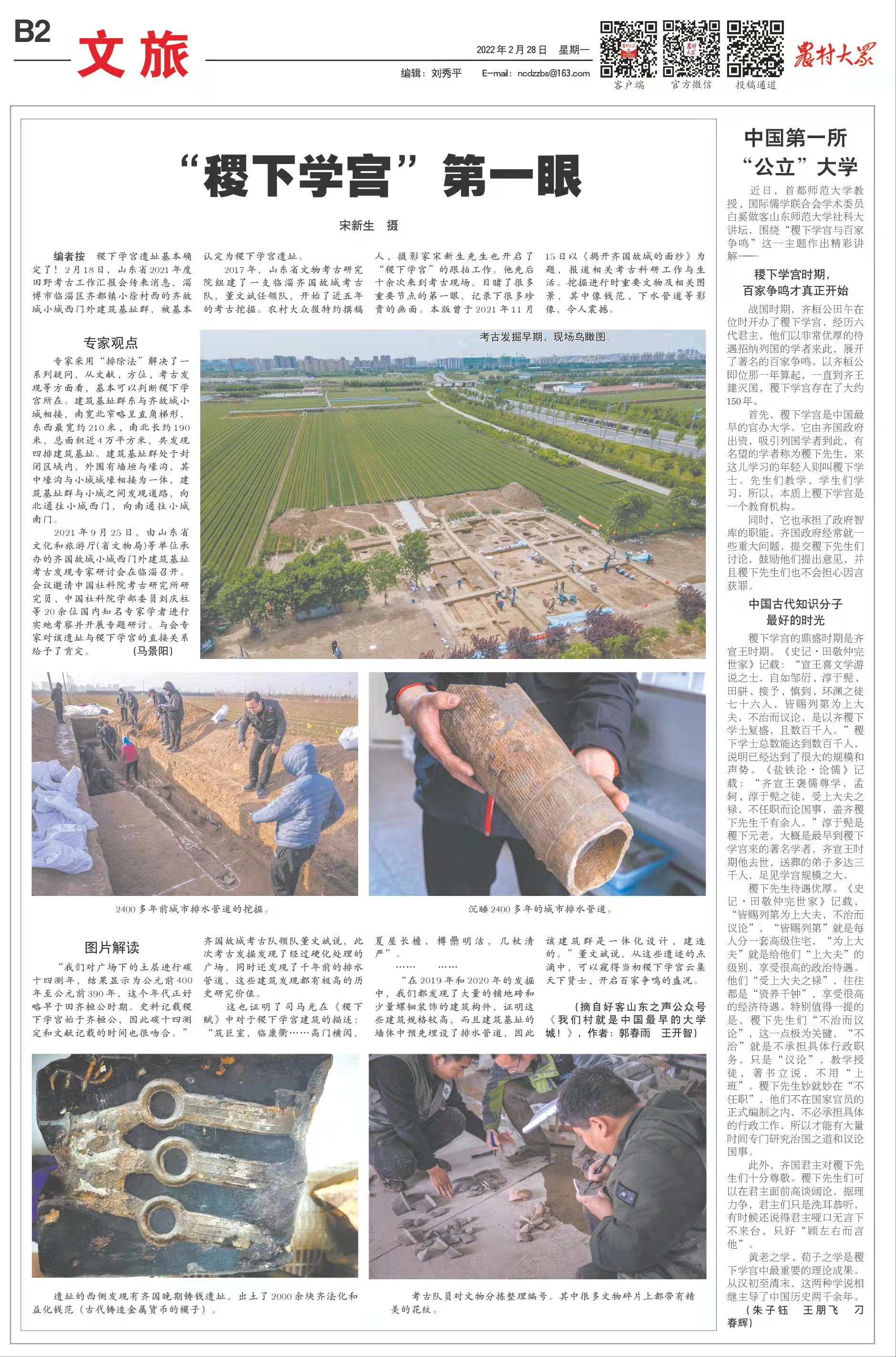 “要加快齐国故城考古遗址公园等项目建设,推动齐国故城遗址、蹴鞠等申报世界文化遗产。”2月18日,淄博市政府工作报告明确提出。稷下学宫遗址基本确定对正在打造齐文化传承创新示范区、深度挖掘城市文化价值、实施齐文化传承创新突破行动的淄博来说,具有无法估量的价值;同时,更对研究中华文化精神具有重要意义。