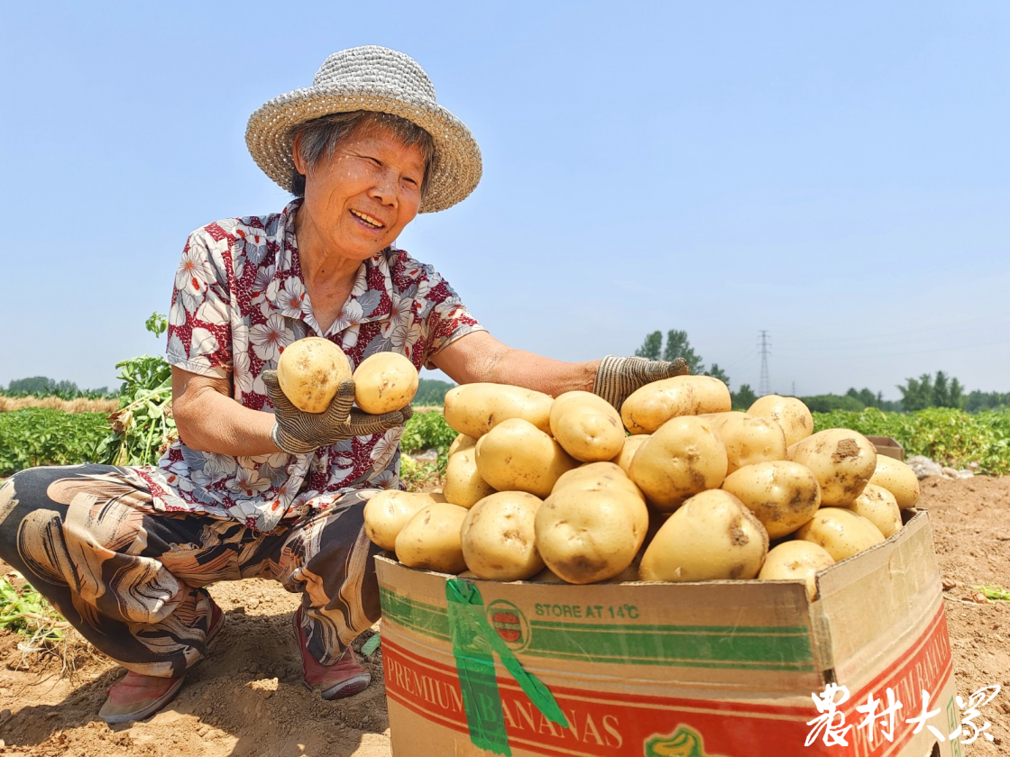 6月2日,郯城县马头镇玉带社区刘花园村北湖片,徐祇茹老人和大儿媳妇正在忙着收获土豆,分捡装箱。新挖的土豆还带着泥土的芬芳,遍地“丰”景。
