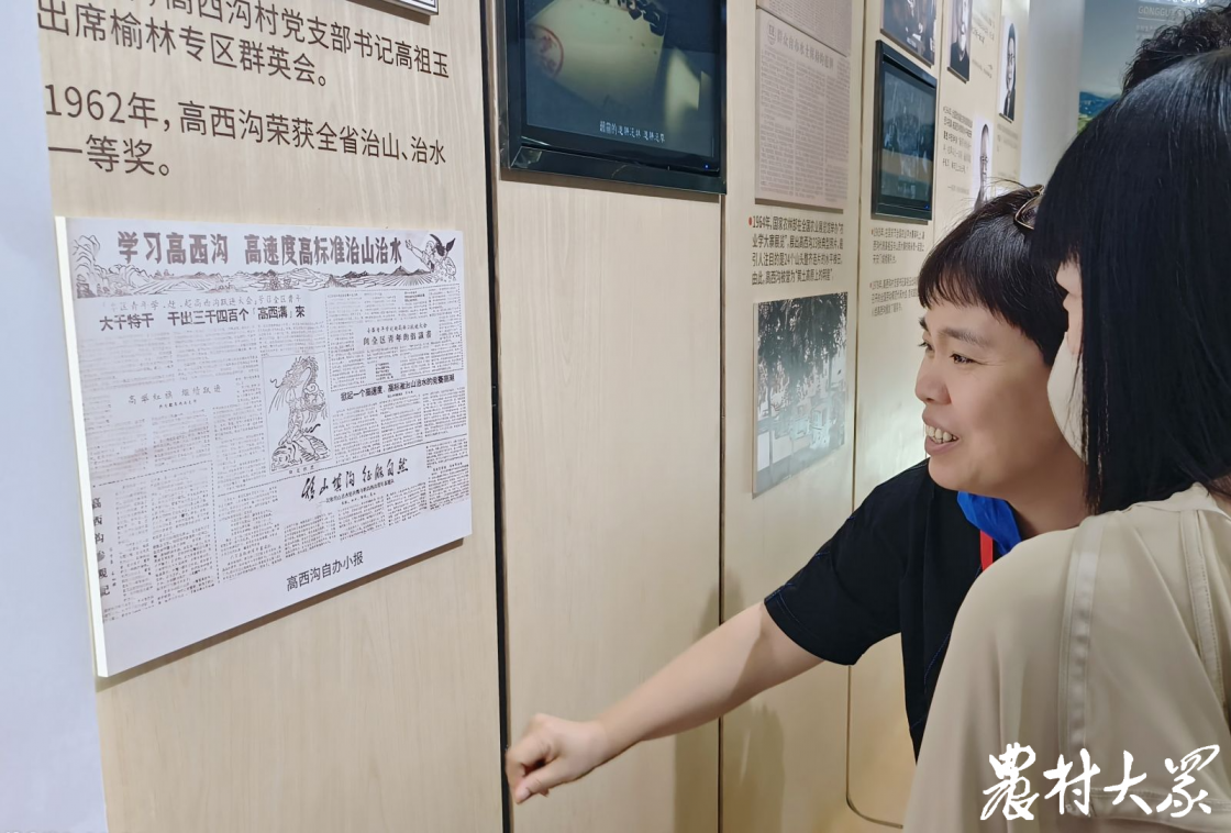在高西沟水保生态展览馆内,一份上世纪60年代的高西沟自办小报吸参观者驻足观看。高西沟村从上世纪50年代开始,将一个沟壑纵横的穷山沟一步步治理成山清水秀的“陕北好江南”。在治山治水过程中,摸索出“三三制”(田地、林地、草地各占三分之一)治理模式。