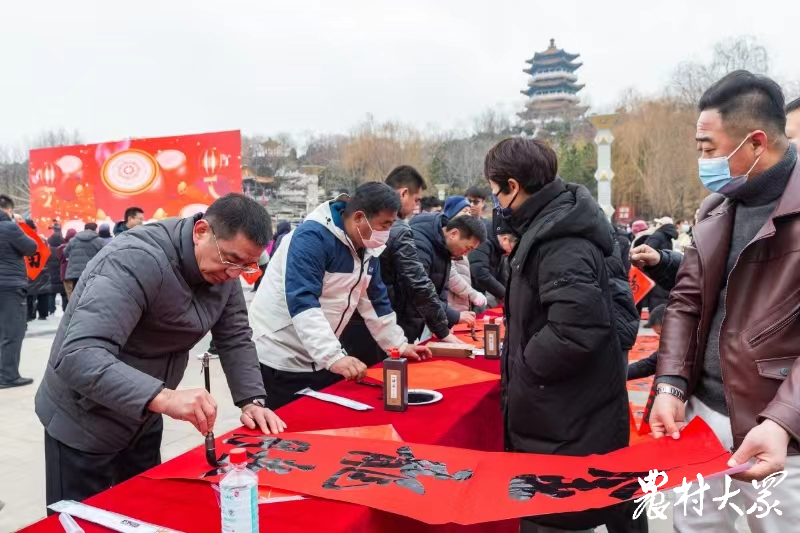 金乡县组织文艺志愿者走进乡村集市写春联送福字。