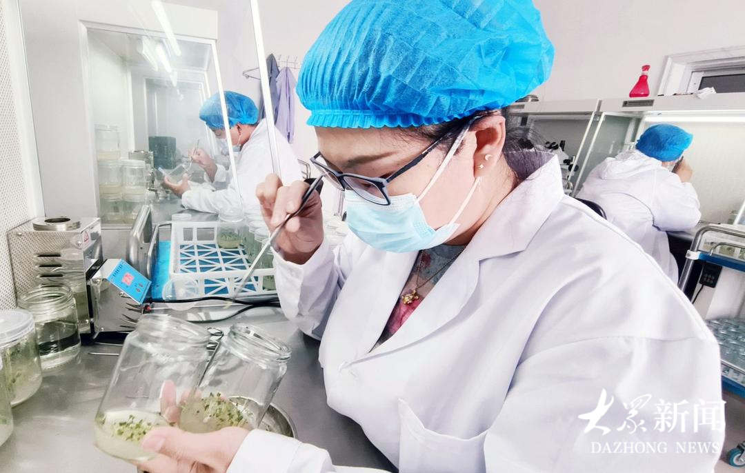 在东胜村办公楼的四楼,实验室、灭菌室、接种室依次排列,培养室则在其对面。4名接受过培训的村民,正全神贯注地操作。生姜组培技术是一种高效关键的脱毒种苗繁殖方法,每个核心环节都要求严谨精细。据了解,当初生姜组培的关键第一步——在显微镜下拨离健康无病虫害的嫩芽,就是董兴忠完成的。