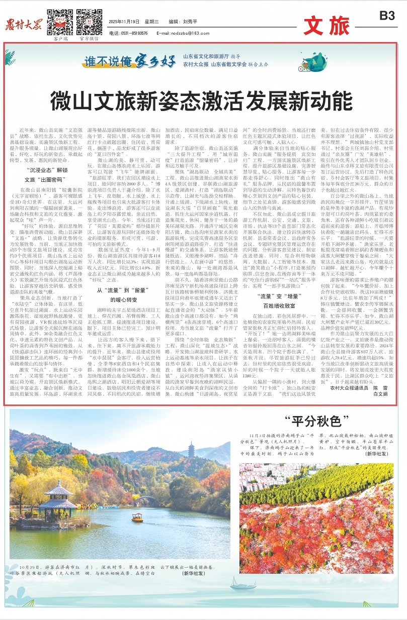 数据见证热度:今年1-9月份,微山湖旅游区共接待游客418万人次,同比增长12.3%;实现旅游收入近5亿元,同比增长14.9%,新业态正让微山湖成为越来越多人的“好玩”之选。
