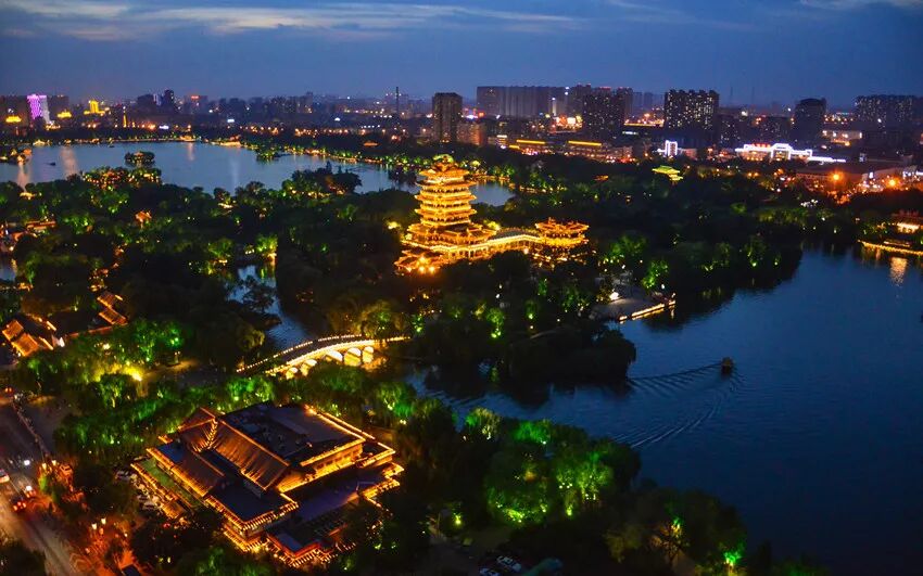 夜的掩映下,穿行在百花洲的院落中,满眼是飞花天影,各类文化展览,在夜间又是一番风景,小南湖夜市、非遗产品展览、传统曲艺表演、流杯池畔的原创民谣等,在夜里,消减了白昼的喧嚣,沉淀下烈日的热浪,无论是游玩还是看展,都更加宁静而深沉,让人专注而自在。