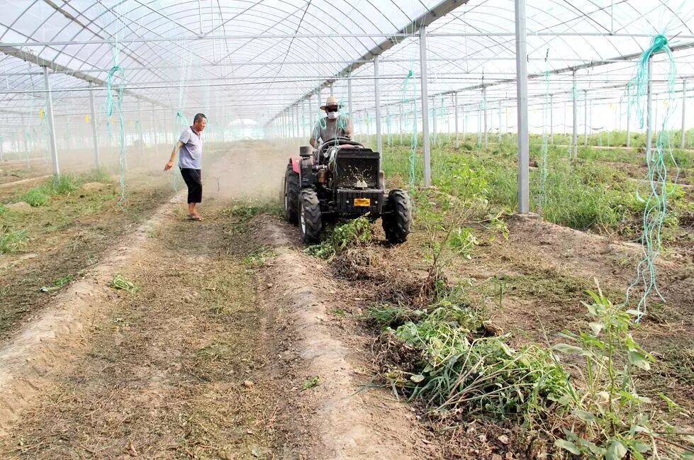 ▲7月20日,仲起萝卜专业合作社的连栋温室大棚里正在进行除草作业,8月底施腐熟大豆底肥,9月初种上萝卜。合作社申请了有机认证,棚内不施用任何除草剂。 (任治安 摄)