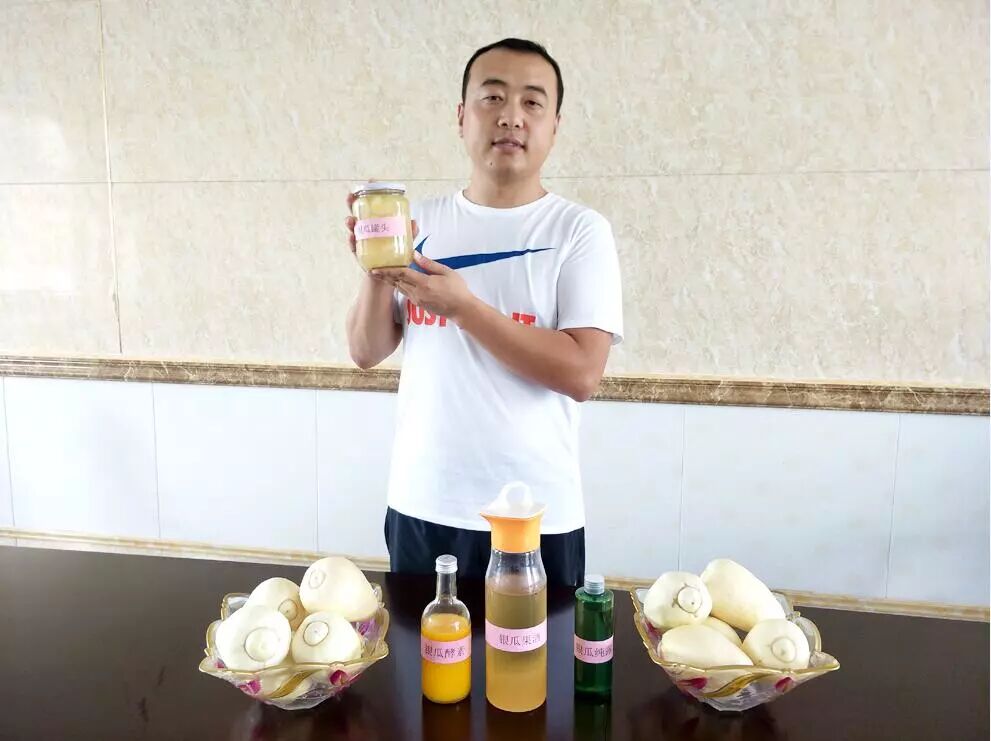 (丁强展示与高校和科研单位合作研发的银瓜深加工产品。)