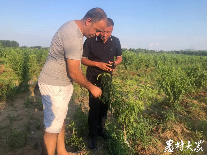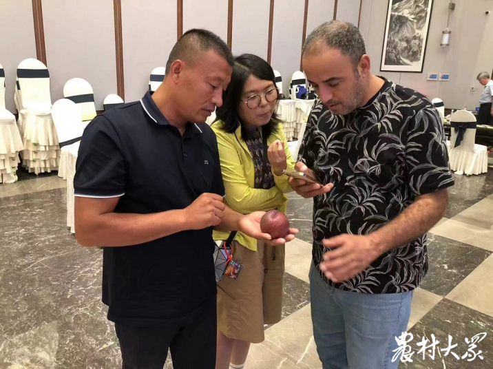 去年7月,在全国桃产业优质桃鉴评大赛中,约旦的巴哈博士对来自山东邹城的新品种桃产生浓厚兴趣。(资料图)