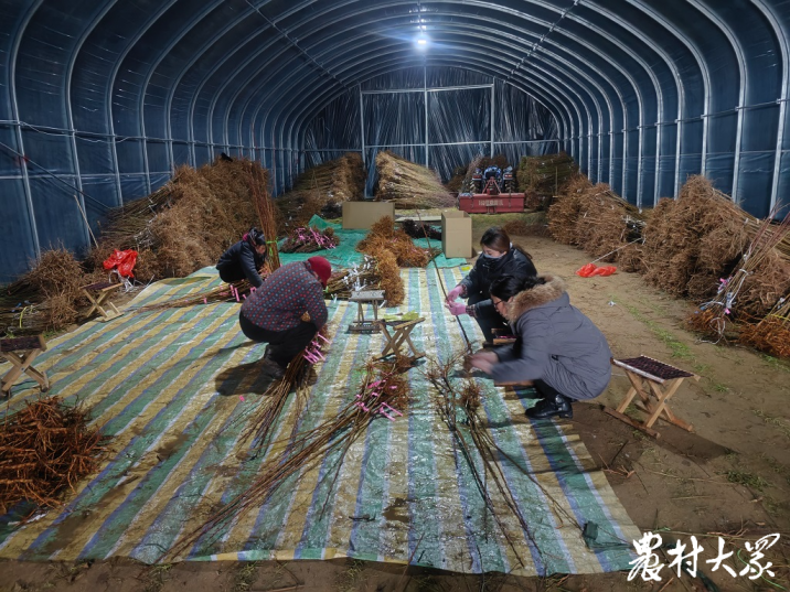 工人们正连夜对桃苗修枝、贴签,打包成捆。